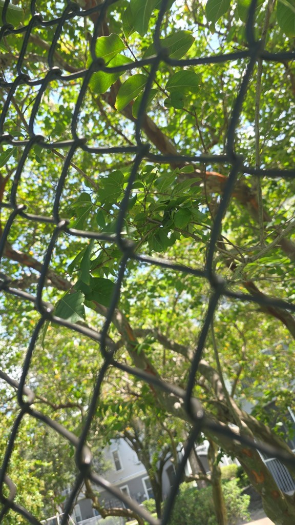 This is what the Lord drew my eyes to. As you can see there are two branches, and the first is growing through the fence while the second one stops short of it, and looks a bit down cast. They both come from the same tree, and yet one pushed forward in spite of the obstacle in front of it while the other did not.